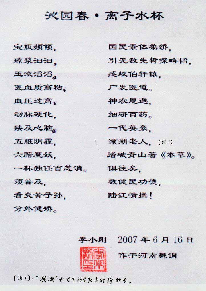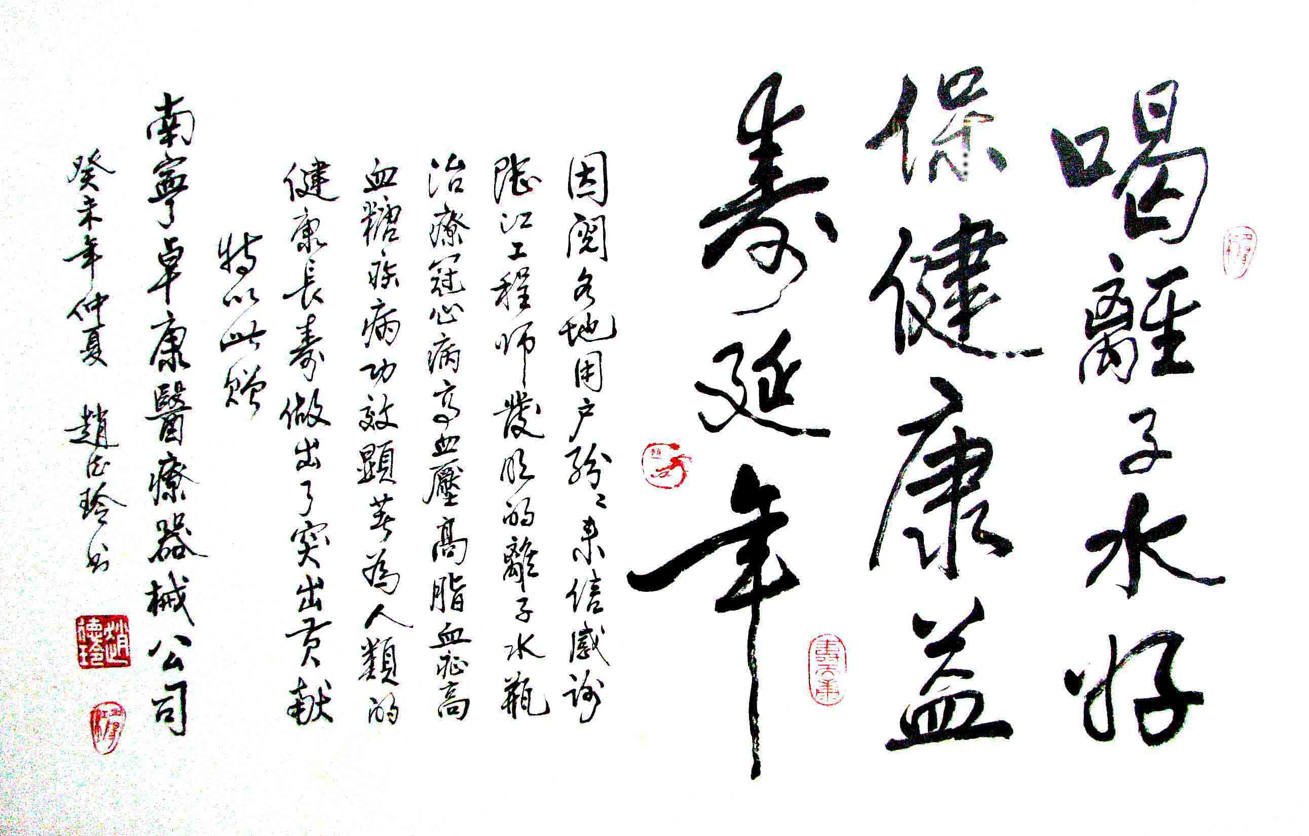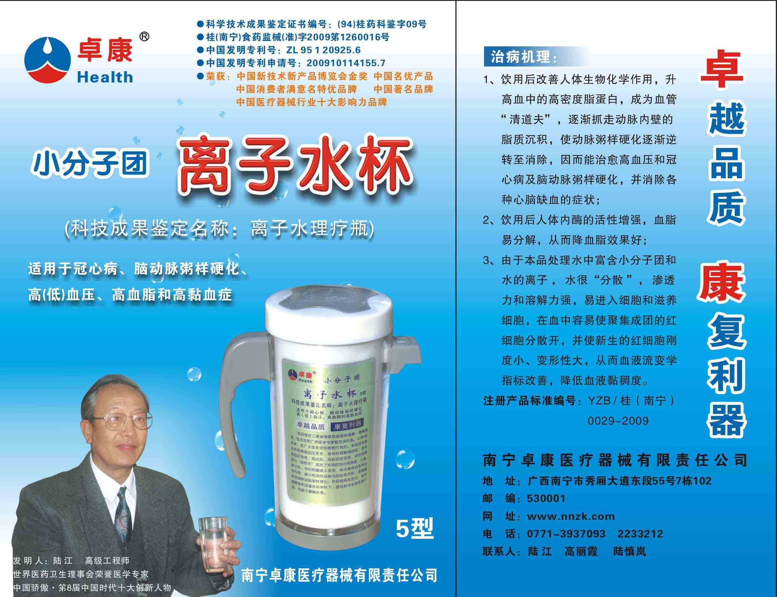 -----我是從事建筑的高工,本來(lái)沒(méi)有資格去攻克醫(yī)學(xué)難題,卻為了自身健康才扣響醫(yī)學(xué)的大門(mén)。由于我1990年患高血壓,因怕中風(fēng)才研究發(fā)明了離子水瓶,我把水處理成微小分子團(tuán)水,飲用后治愈了高血壓。便于1993年底送到三家省級(jí)醫(yī)院做臨床試用4個(gè)月。經(jīng)北京和廣西醫(yī)學(xué)專家鑒定:"降脂降壓效果好"," 能擴(kuò)大心腦動(dòng)脈流量,改善心腦電圖以及微循環(huán)","對(duì)治療心腦動(dòng)脈粥樣硬化、高血壓、高血脂有良好的醫(yī)療保健作用。""產(chǎn)品的技術(shù)性能和療效達(dá)到了同類產(chǎn)品的國(guó)內(nèi)領(lǐng)先水平,經(jīng)廣西醫(yī)學(xué)科學(xué)情報(bào)研究所檢索,未見(jiàn)國(guó)外有類似報(bào)道。"中國(guó)醫(yī)學(xué)科學(xué)院張正國(guó)教授從美國(guó)國(guó)立醫(yī)學(xué)圖書(shū)館數(shù)據(jù)庫(kù)存Medline檢索英俄文資料,均未見(jiàn)類似報(bào)告。2000年上市后,我為了對(duì)消費(fèi)者負(fù)責(zé)而繼續(xù)觀察研究,一直通過(guò)《信譽(yù)卡》和《質(zhì)量跟蹤調(diào)查書(shū)》向患者承諾療效,請(qǐng)用戶使用6個(gè)月后反饋效果。和脂壓患者飲用2至5個(gè)月內(nèi),消除癥狀,停服藥物,血壓正常;冠心病患者飲用3~5個(gè)月逐漸減輕至消除心絞痛、房顫等癥狀,不再服藥,飲用1年左右心電圖正常,經(jīng)冠脈造影掃描無(wú)明顯狹窄,表明冠心病痊愈。大量患者還反映許多衰弱器官被修復(fù),讓前列腺增生、慢性咽喉炎、慢性氣管炎、支氣管炎、慢性胃炎、腸炎和膽囊炎等不藥而愈;2型糖尿病患者是因?yàn)橐葝u衰弱致病,飲用該水半年至一年,逐漸減藥至停藥,血糖尿糖正常,真正治愈2型糖尿病。中風(fēng)后遺癥患者飲用六七個(gè)月,可逐漸減輕至消除肢體和語(yǔ)言障礙,表明飲用該水能讓壽命很長(zhǎng)的神經(jīng)元細(xì)胞逐漸修復(fù),奇跡般地恢復(fù)肢體和語(yǔ)言功能。飲用后還使胸腺和脾臟兩個(gè)重要的免疫器官被修復(fù)和增強(qiáng),產(chǎn)生免疫細(xì)胞多,提高了免疫力,使人不生病或少生病。自此, 飲用微小分子團(tuán)水創(chuàng)造了攻克冠心病、高(低)血壓和糖尿病三大醫(yī)學(xué)難題的奇跡。人們對(duì)此感到不可思議,但實(shí)踐是檢驗(yàn)真理的唯一標(biāo)準(zhǔn)。